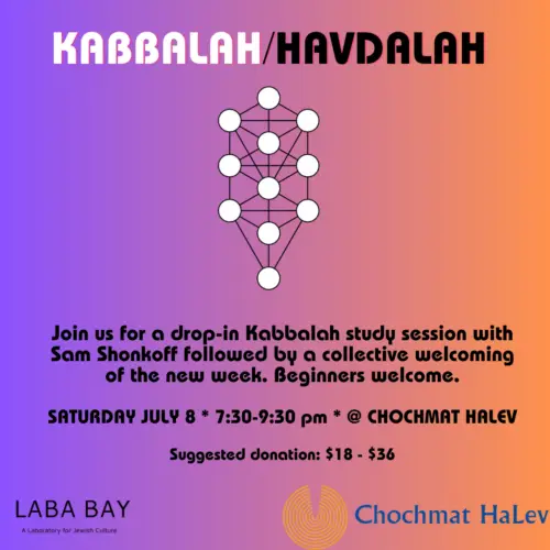 Chochmat HaLev is teaming up with LABA BAY: A Laboratory for Jewish Culture to present KABBALAH / HAVDALAH, a drop-in Kabbalah course taught in LABA’s open-to-all-the-possibilities teaching style held at Chochmat HaLev. LABA Bay faculty and GTU professor Sam Shonkoff will be leading the innovative study session, which will be followed by a group-led Havdalah ceremony. More info »
