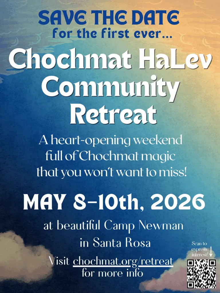 Expect games, a talent show, a dance, campfire (with s’mores!), and activities designed to weave our community even closer together. Kids will have their own engaging and age-appropriate programming, while adults enjoy time for reflection, creativity, and connection. It’s the full Chochmat experience: inspired, embodied, and shared.